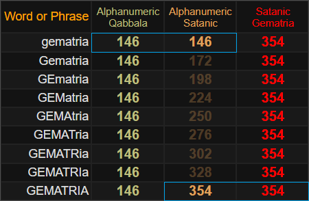 Besides this, there's also the following consideration: if a word or phrase contains both lower- and uppercase letters, then the difference between its value in Alphanumeric Satanic and its value in both AQ and Satanic Gematria will always be 26 or one of its multiples.